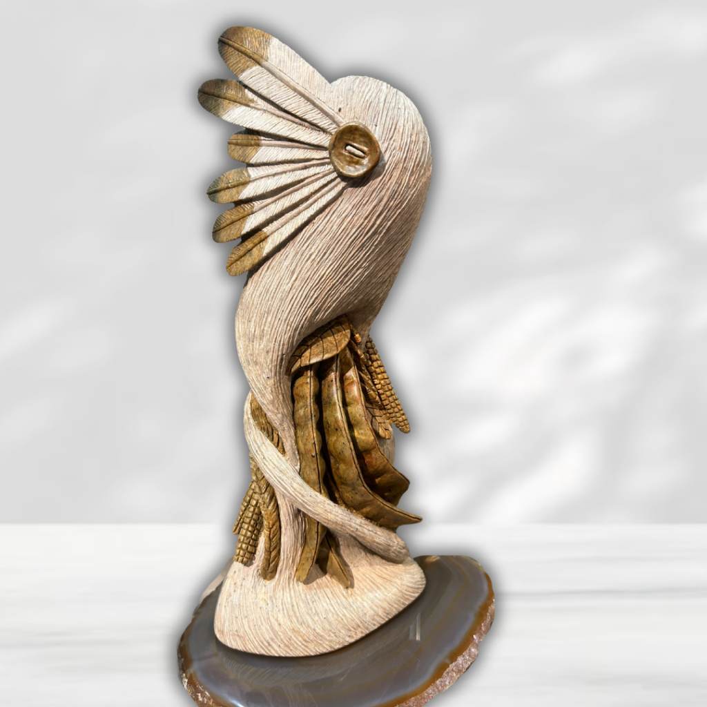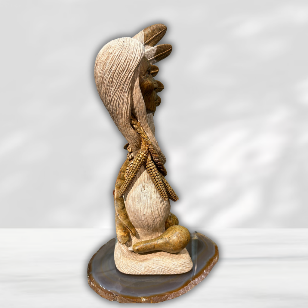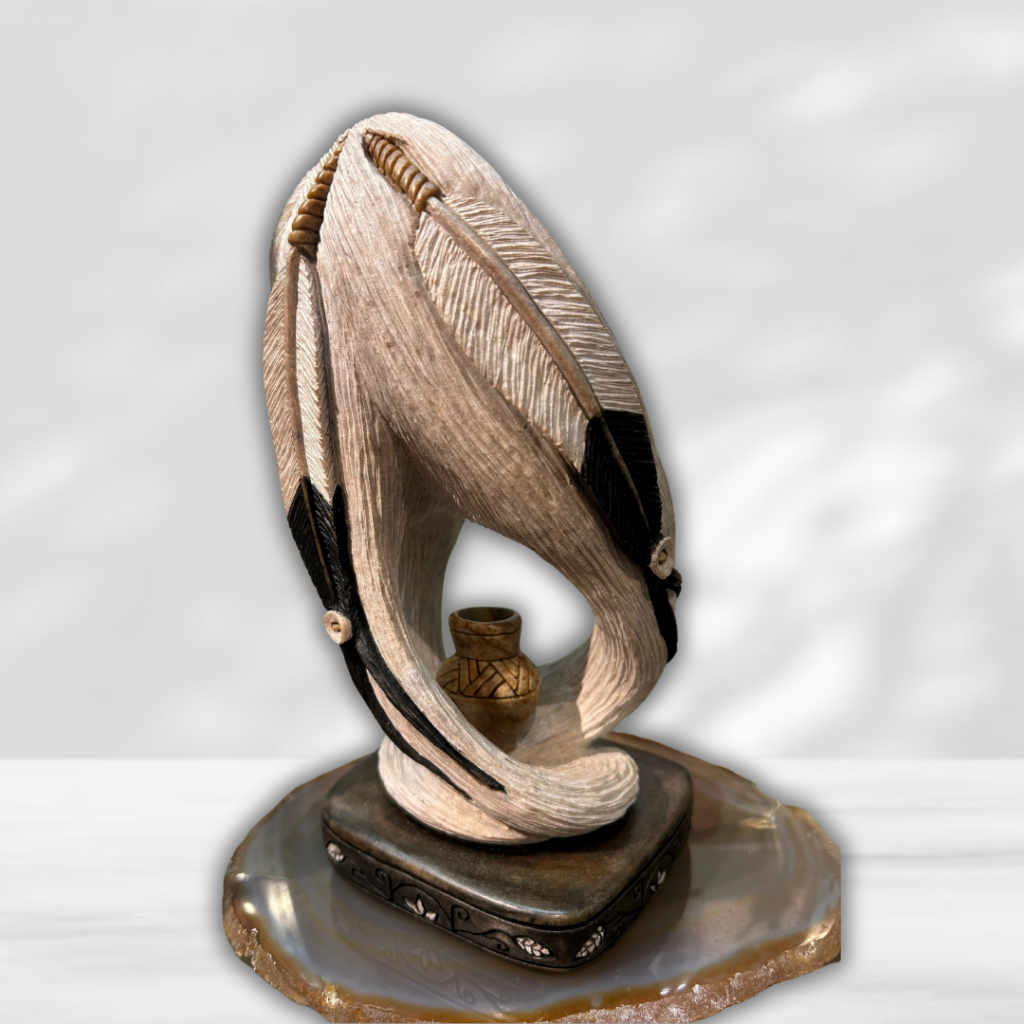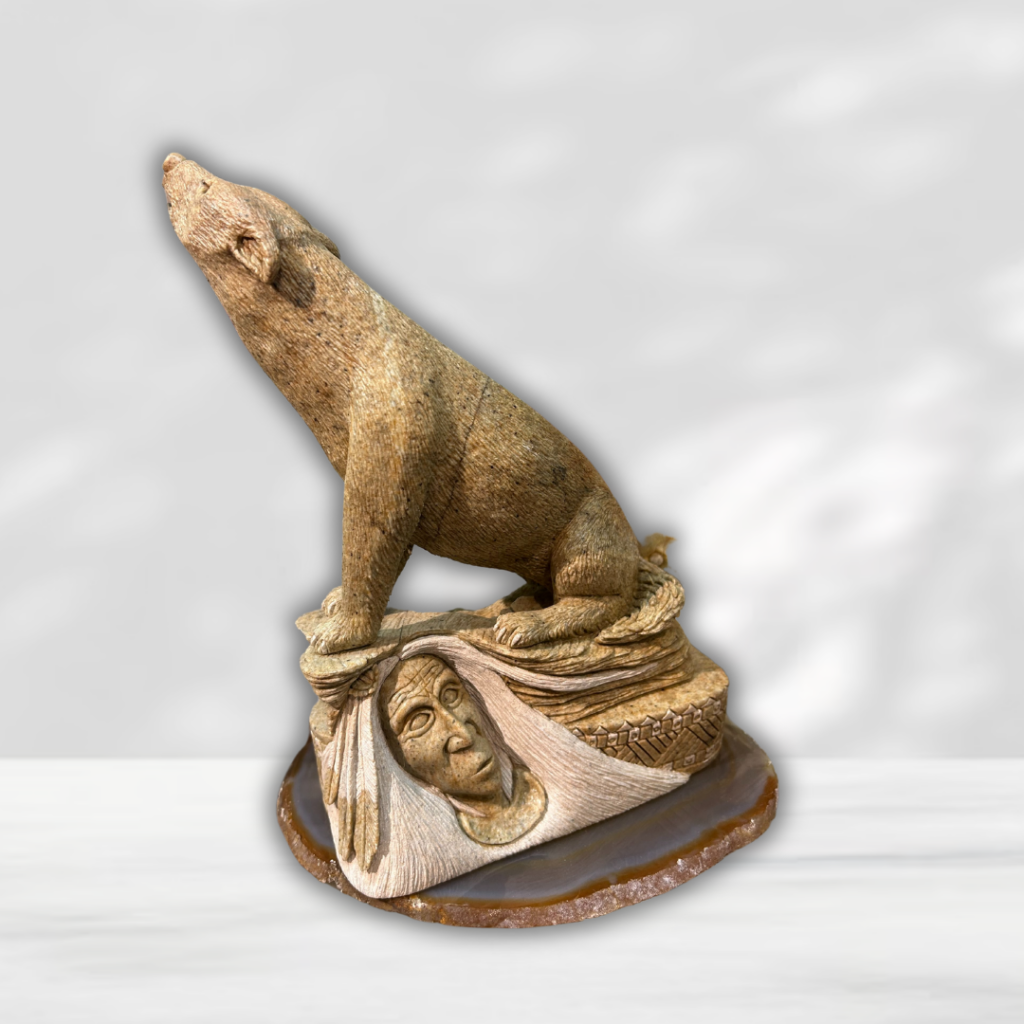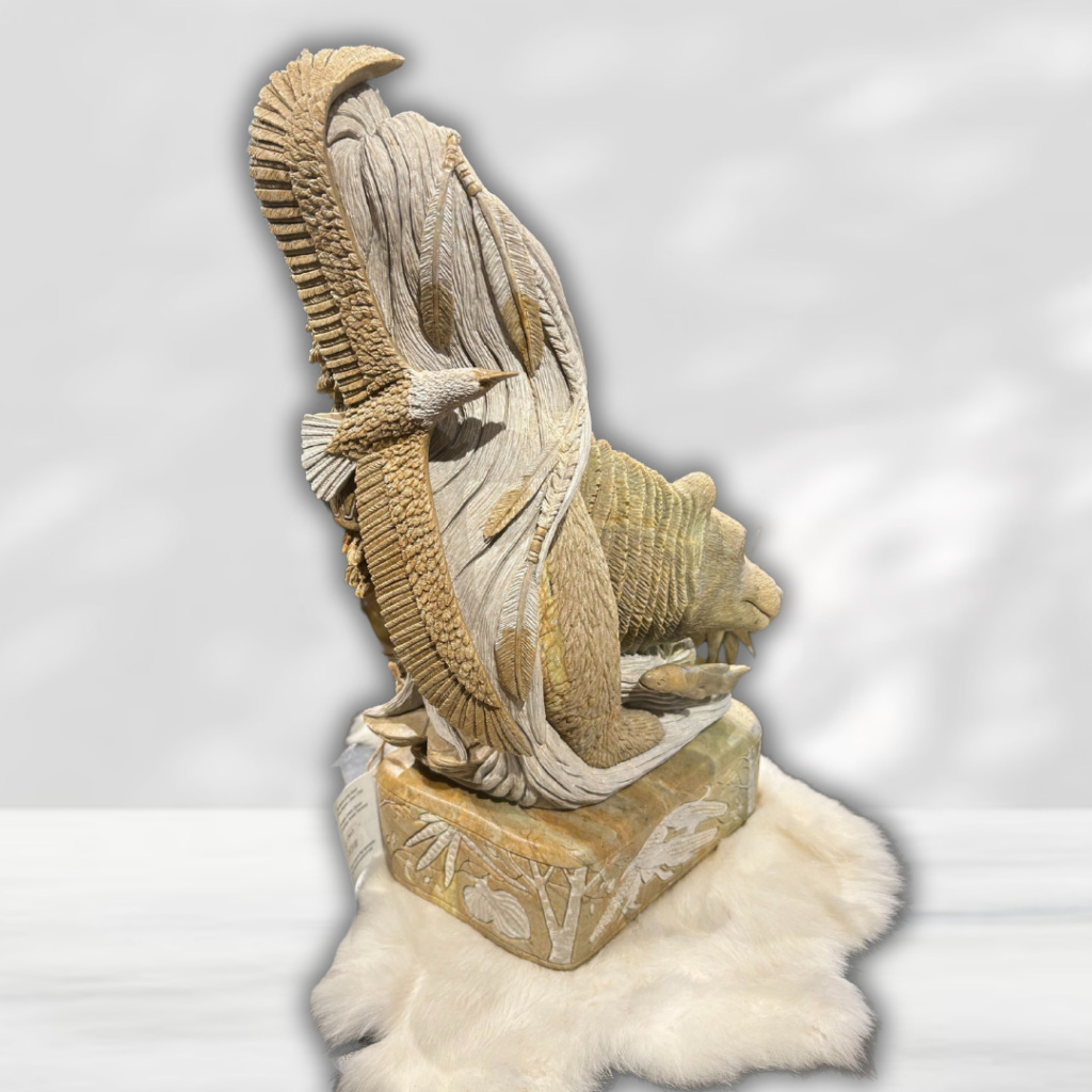 Iroquois sculpture usually reflects the mythology, culture & histories of the ‘People of the Longhouses’. Figurative works are often meant to celebrate the guardians of the harvest or what is referred to as the ‘Three Sisters’. Wildlife sculpture is often paying homage to Clan affiliations and other cultural beliefs. Noted for the superior workmanship and attention to detail, Haudenosaunee Art is highly regarded within the First Nations art world.